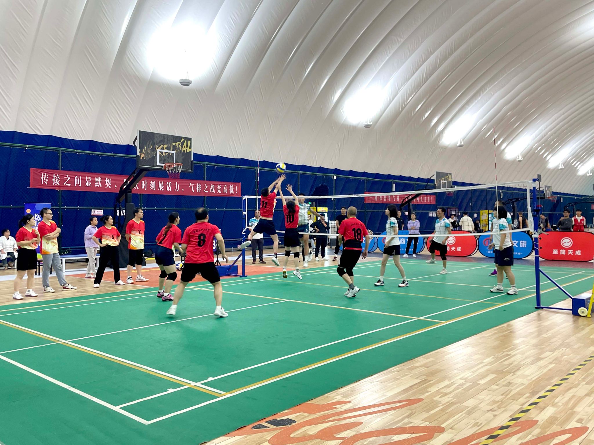 比赛期间,现场气氛热烈,活力四射。羽毛球项目中,精准吊球、强力扣杀轮番上演,选手步法灵活、配合默契,每一次攻防转换都扣人心弦;气排球赛场则尽显团队协作力量,一传、二传、扣杀衔接流畅,队员间相互呐喊鼓劲,即便落后也绝不轻言放弃。