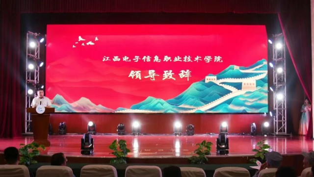 江西电子信息职业技术学院副校长周重军在开幕式致辞中说到:红色基因是中华民族的精神命脉,青年学子应赓续革命薪火,将爱国情怀转化为担当实干的青春力量。随后,该校以古典舞蹈《一梦惊鸿》惊艳开场,舞者以翩跹之姿将传统文化与红色精神交融,赢得满堂喝彩。